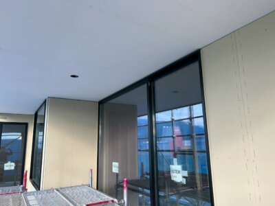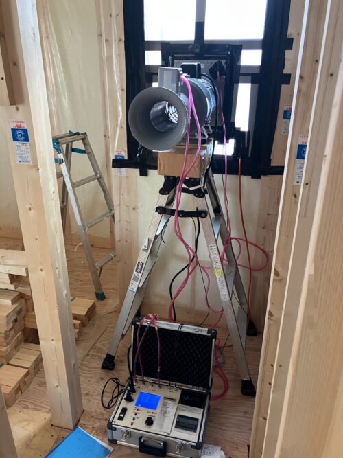 こんにちは。工務の山本です。先日、中央市のチェックハウス S様邸にて吹付断熱工事と気密測定を行いました。吹付断熱工事は壁と屋根面をウレタンフォームで覆います。グラスウールより隙間なく充填させられるので