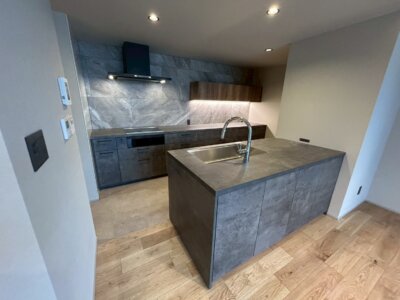 こんにちは樋泉です甲府市のCHECK HOUSEにてキッチンの設置を行いました(^^♪GRAFTEKTのキッチン!!シンクをリビング側に配置した2列型のキッチンです(^^)/壁にはタイルを施工し、照明