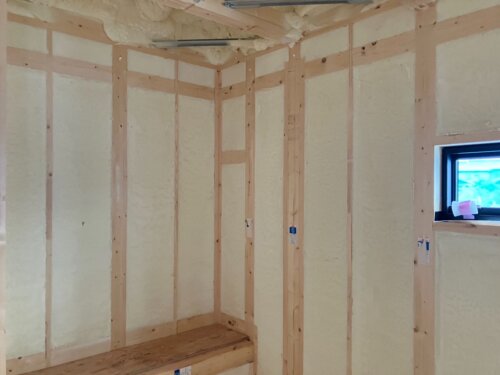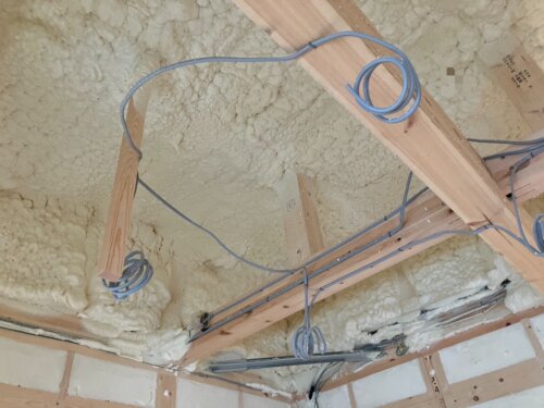 吹付断熱工事は壁と屋根面をウレタンフォームで覆います。