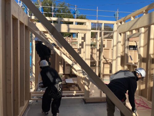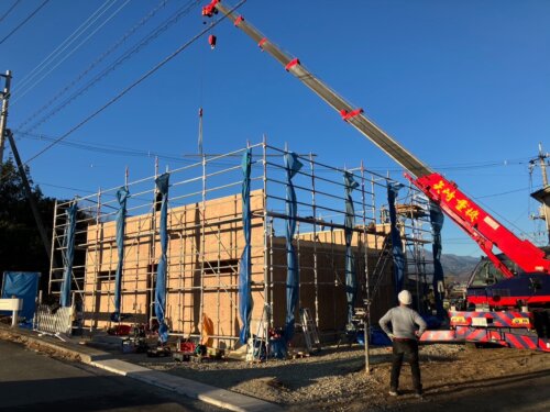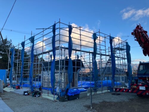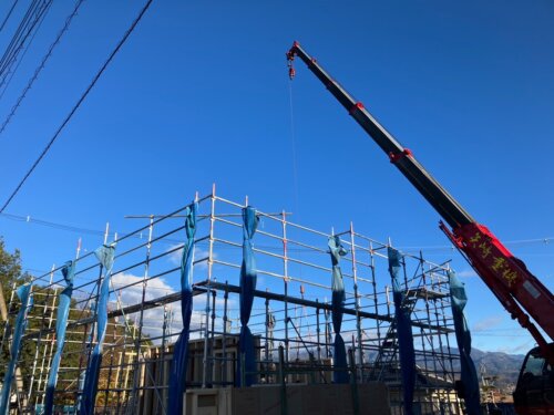昨日、笛吹市のZERO-CUBE KAIの現場にて建て方作業を行いました。
