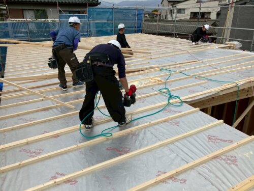 翌日が雨天という事もあり、外部の耐力面材の施工も進めていきました。